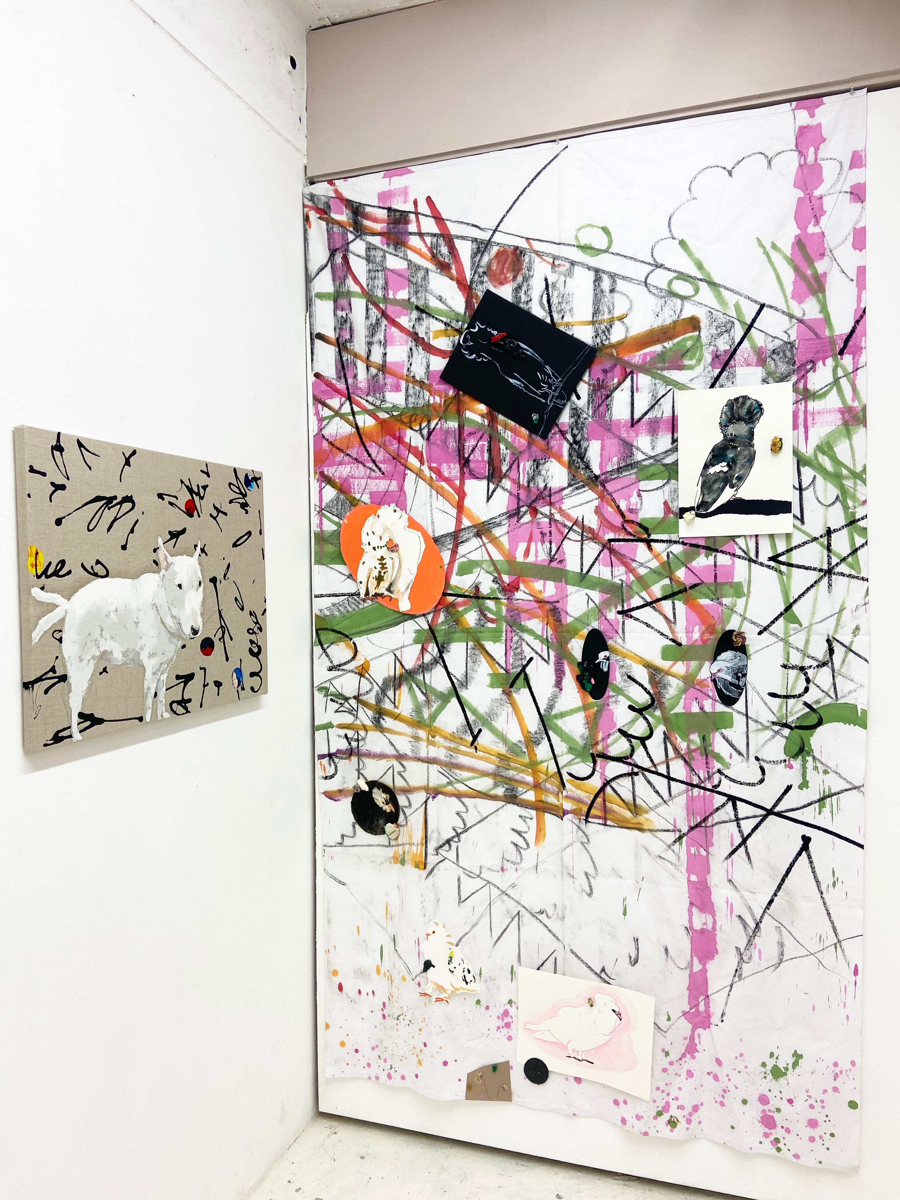 背景の大きな布は2016年に田中がライブペインティングで制作したもの。